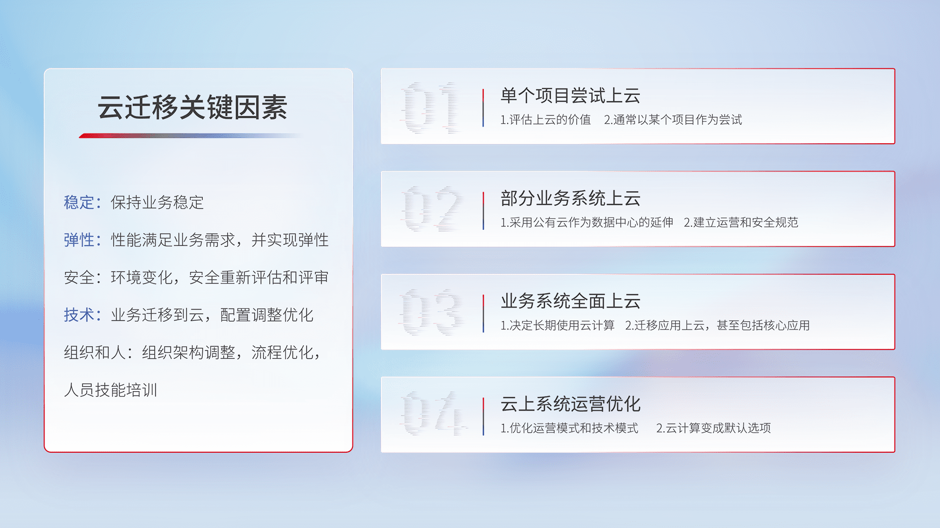 结合实际业务,,,,从规划设计、、、云平台选型、、、、云原生改造、、、数据迁移、、、、集成交付,,,,迁移全过程为客户识别最佳上云路径,,,做好风险识别管理,,,,设计网络架构、、身份权限、、、安全审计合规、、操作审计、、、、日志审计、、、监控告警策略、、、、多站点容灾设计等,,,,对云上基础设施进行整体规划,,,,提升IT治理水平,,以满足弹性、、、、高可用、、、高性能的需求。。。。