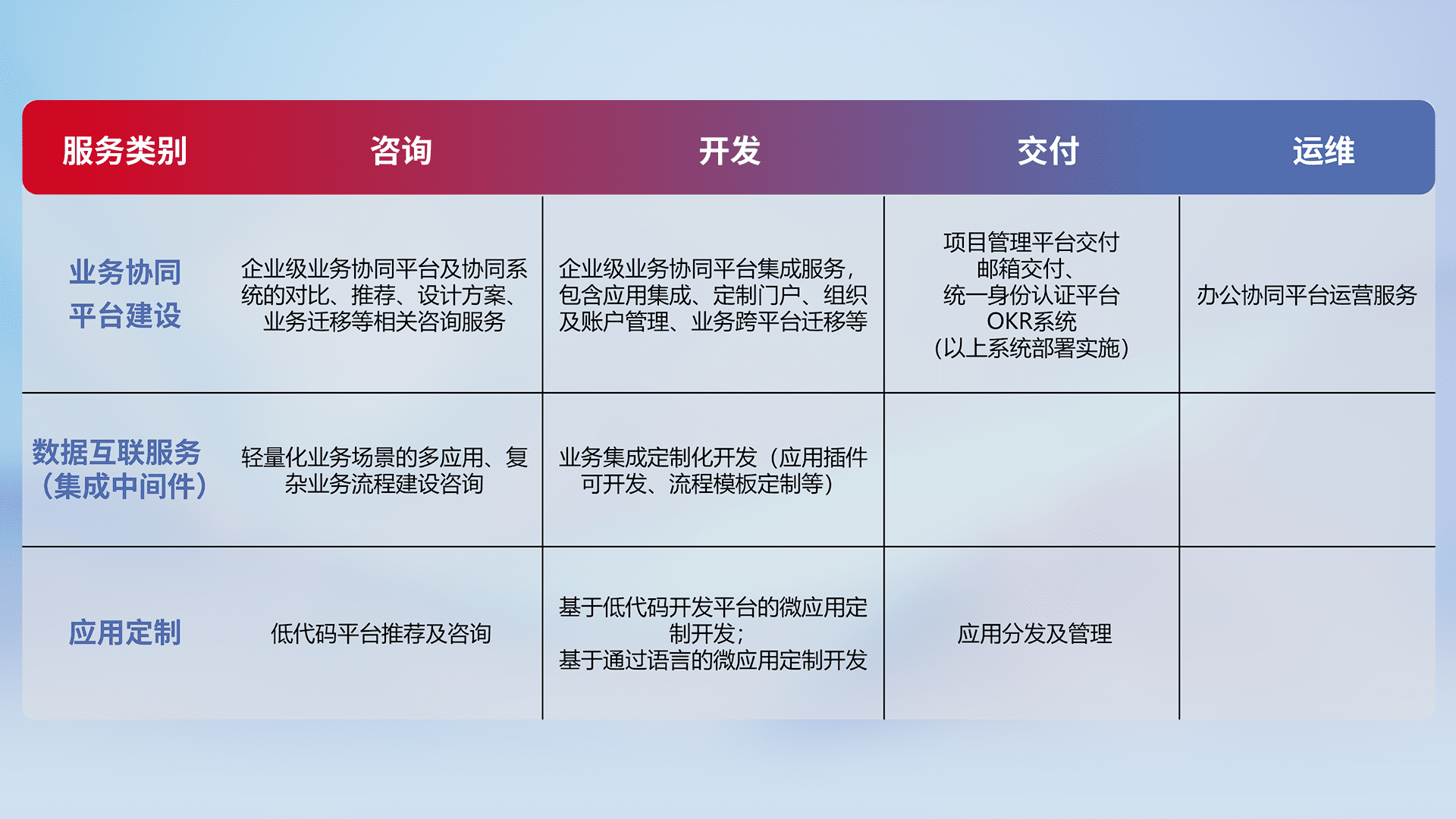 针对钉钉、、、企微、、、、IDaas等平台级产品提供产品的规划、、、方案、、交付、、定制化开发等服务,,,实现如统一协同办公、、、智能客户服务、、、混合会议管理、、、智能数据查询、、等业务场景,,,,实现数字化转型。。。。